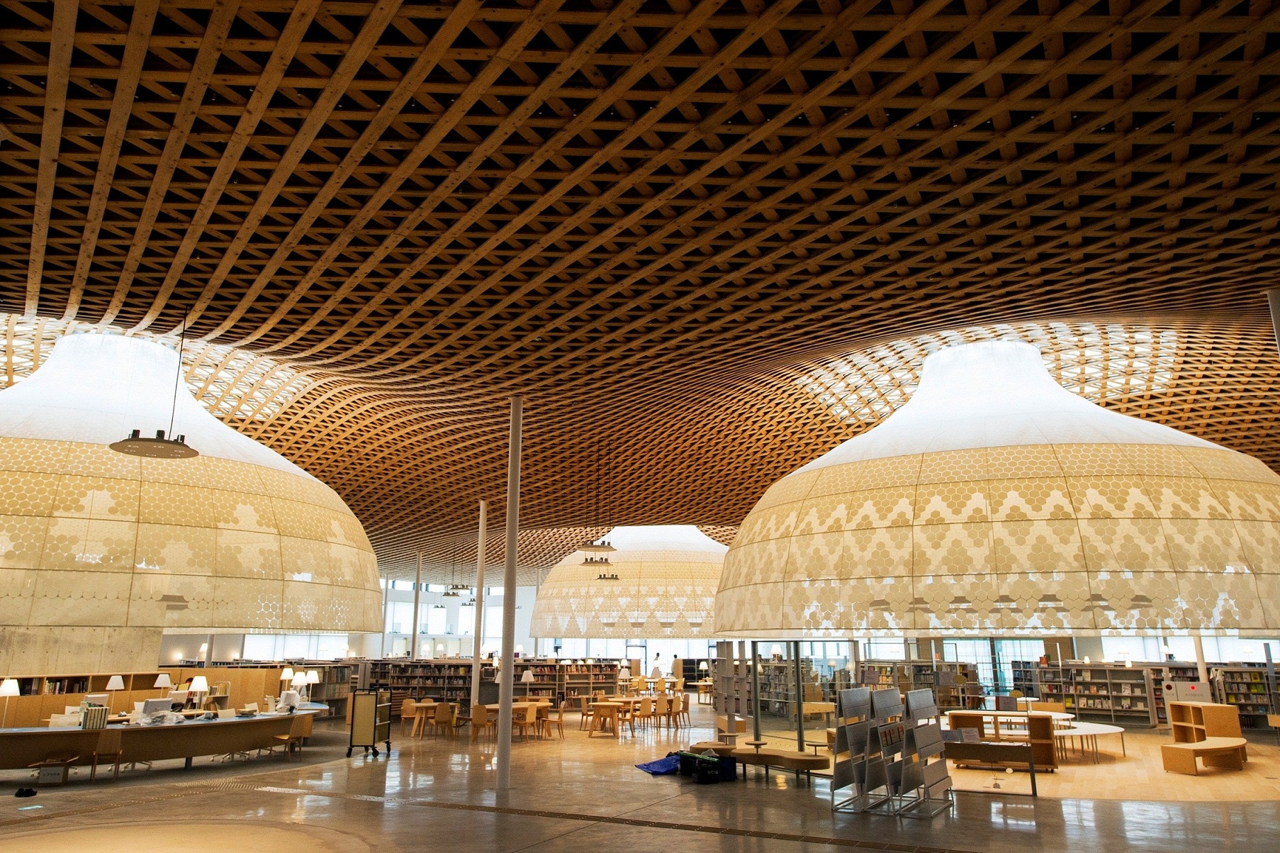 岐阜市の中心市街地に建つ図書館を中心とした複合施設.1階に書庫と,展示ギャラリー,多目的ホール,市民活動交流センター,2階は開架閲覧エリア.波打つ木造の屋根が約80m×90mの方形平面を覆う.天井高約6mのワンルーム空間にポリエステルファブリックによる直径8〜14mの「グローブ」が天井から吊られ,閲覧コーナーや受付カウンターといった領域をつくり出す.