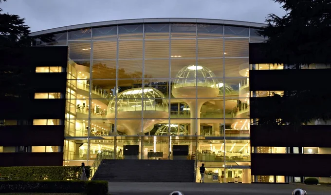 成蹊学園創立100周年記念事業の一環として、2006年に竣工した大学図書館。外壁は既存の本館に合わせた煉瓦タイルを使用しつつ、各階がリボンウィンドウによって完全に分離され、宙に浮いているかのように見える意匠が特徴的である。