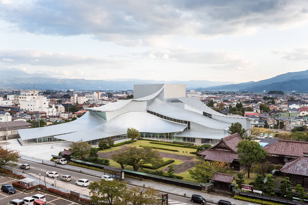 地域の文化芸術活動拠点となる文化会館の建て替え.フライタワーを中心に小さな屋根群が集まる形として,建物の大きさを分節している.分節された屋根は外周に向かって低くなり,道路沿いでは平屋となる.それにより隣接する歴史的建造物や周辺の住宅を中心とした街並みとの調和を目指した.